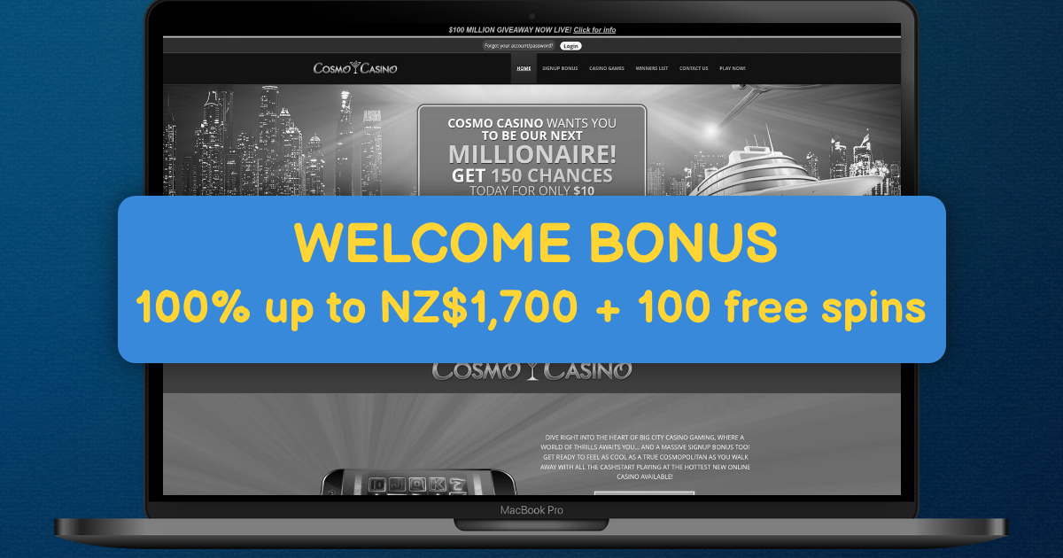 Cosmo Casino centers its promotions on simple signup incentives and recurring rewards. Players in NZ can claim free spins and a match bonus for real money play on the official site.